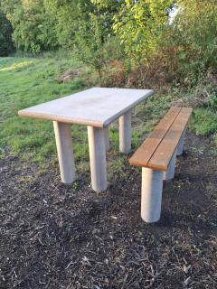 Am Bauwagen haben wir mit viel Arbeit eine schöne und massive Sitzecke aus Beton direkt unter dem großen Baum geschaffen. Stück für Stück wird es immer gemütlicher. Alles natürlich Marke Eigenbau.